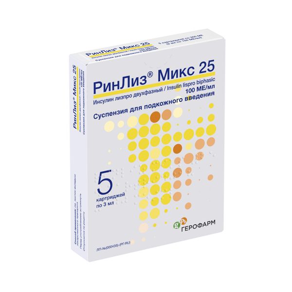 РинЛиз® Микс 25 представляет собой готовую смесь, состоящую из раствора инсулина лизпро 25 % (аналог человеческого инсулина короткого действия) и суспензии инсулина лизпро протамина 75 % (аналог человеческого инсулина средней продолжительности действия). Основным действием инсулина лизпро является регуляция метаболизма глюкозы.