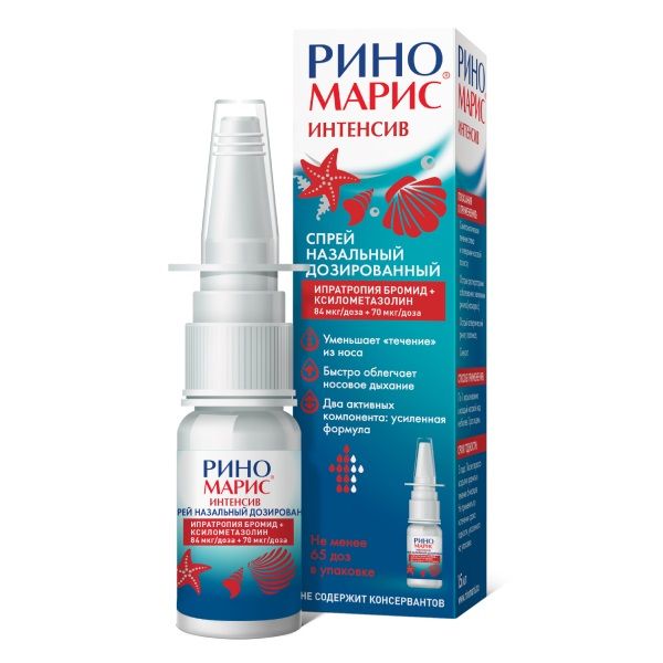 Симпатомиметические препараты вызывают высвобождение катехоламинов, в том числе норадреналина, обладающего сосудосуживающим эффектом, вследствие чего повышается артериальное давление. При значительном повышении артериального давления лечение препаратом Риномарис® Интенсив следует отменить и провести симптоматическое лечение. При сопутствующем назначении других препаратов, обладающих антихолинергической активностью, возможно усиление антихолинергического эффекта ипратропия бромида. Вышеуказанные взаимодействия изучались индивидуально для обоих действующих веществ, входящих в состав препарата Риномарис® Интенсив. В комбинации для обоих действующих веществ вышеуказанные взаимодействия не изучались.
