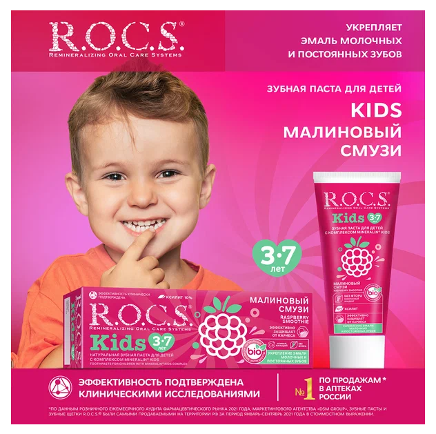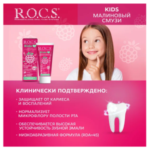 Приятный вкус зубной пасты ROCS Kids «Малиновый Смузи», напоминающий душистую малину, низкоабразивная формула и уникальный состав позволяют обеспечить правильный и приятный уход за полостью рта ребенка, начиная с 3-х лет защитить зубы от кариеса и приучить малыша к ежедневной гигиене ротовой полости без уговоров и нареканий.