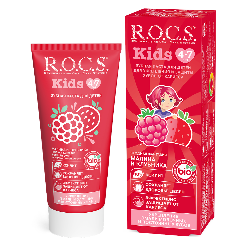Зубная паста для детей от 4 до 7 лет R.O.C.S. Kids «Малина и Клубника» обеспечивает эффективную гигиену ротовой полости, защищает нежную эмаль от растворяющего действия кислот, предохраняет зубы от кариеса, обеспечивает бережный уход за деснами.