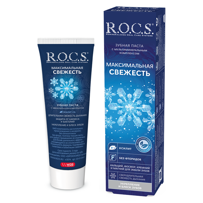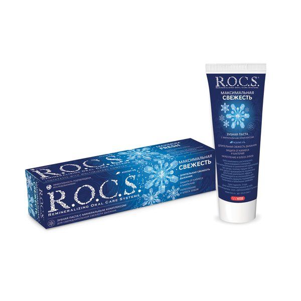 Зубная паста R.O.C.S. Максимальная свежесть содержит уникальный ароматизатор, который обладает замедленной ферментацией, сохраняя свежесть полости рта даже после приема пищи. Паста позволяет надолго сохранить свежесть дыхания, ощущение чистоты и гладкости зубной эмали.