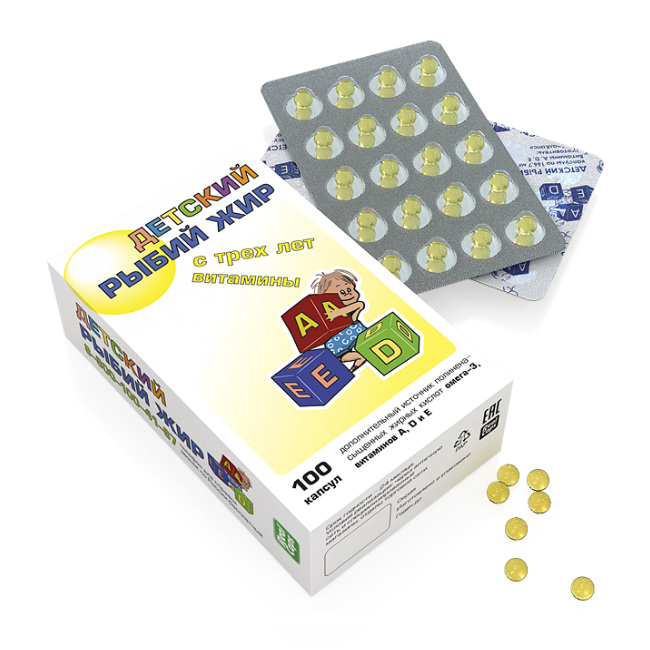 Рыбий жир детский - это биологически активная добавка к пище, которая содержит ценные жирные кислоты Омега-3, необходимые для полноценного развития ребенка. В составе препарата - 200 мг рыбьего жира в каждой капсуле, позволяющее обеспечить организм ребенка необходимой дозой Омега-3. Не содержит искусственных красителей и консервантов.