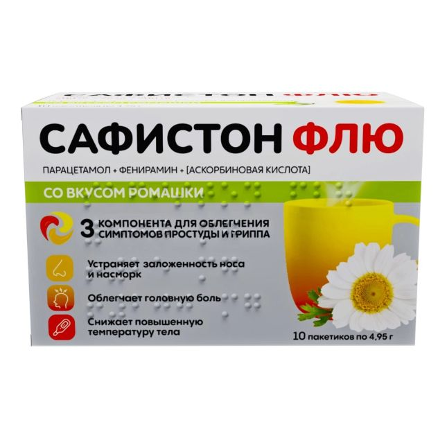 Сафистон Флю порошок для приготовления раствора для приема внутрь со вкусом ромашки 500мг+25мг+200мг пакеты 4,95г №10