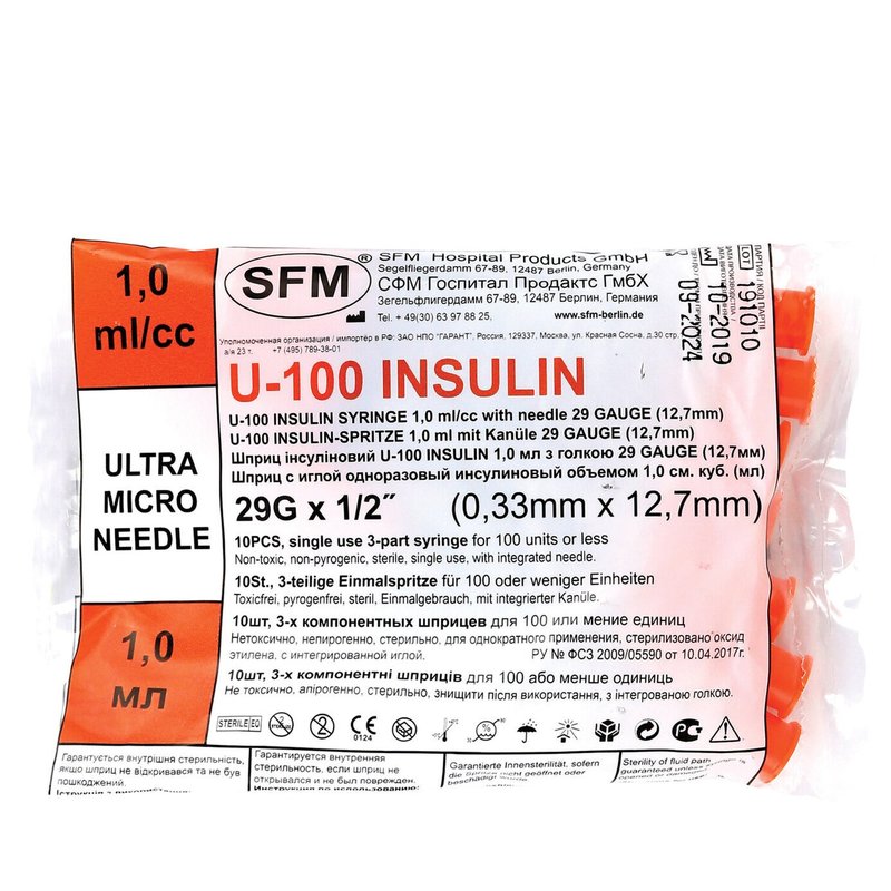 Производство SFM Hospital Products GmbH, Германия объём шприца – 1,0 мл шкала - U-100 (оранжевый колпачок) размер иглы - 0,33 х 12,7 мм 29G игла - интегрирована (напаяна) на шприц компонентность - 3 (цилиндр + поршень + манжета) стерилизация - Оксид этилена упаковка - полибэг.