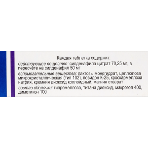 Каждая таблетка содержит 50 мг силденафила (в виде силденафила цитрата).
