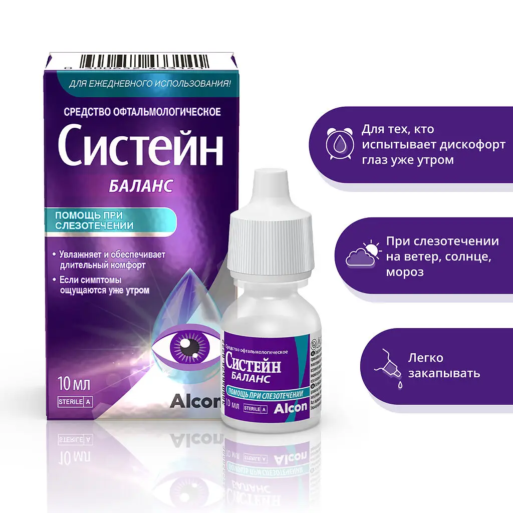 Систейн® Баланс - это увлажняющие капли для глаз с системой Lipitech® (минеральное масло+анионы фосфолипидов), которая восстанавливает все слои слезной пленки. Средство офтальмологическое на масляной основе увлажняет поверхность глаза, стабилизирует липидный слой слезной пленки и уменьшает испарение слезной жидкости. СИСТЕЙН® БАЛАНС увлажняет поверхность глаза, восполняет и стабилизирует липидный слой слезной пленки и уменьшает чрезмерное испарение слезной жидкости. Обеспечивает длительное временное облегчение симптомов синдрома «сухого глаза», таких как жжения и раздражения при синдроме сухого глаза.