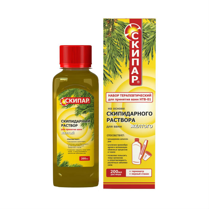 Скипидарный раствор желтый СКИПАР связывает свободные радикалы, омолаживая клетки, нормализует обмен веществ, снижает артериальное давление. Рекомендуется лицам с повышенным артериальным давлением. Желтые скипидарные ванны СКИПАР способствуют улучшению капиллярного кровообращения, расширению просветов капилляров. Способствуют рассасыванию гематом, рубцов и спаек, увеличивается выход из организма хлористого натрия и воды. Скипидарные ванны СКИПАР эффективны в комплексной терапии при простудных заболеваниях и заболеваниях верхних дыхательных путей, при заболеваниях опорно-двигательного аппарата (остеохондроз, артрит, артроз), при нарушении обмена веществ (избыточный вес), при варикозном расширении вен нижних конечностей, при тромбофлебитах.
