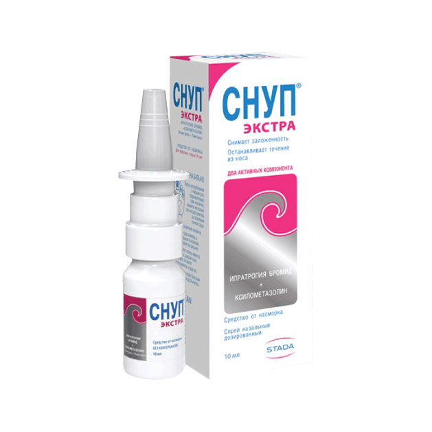 Одно вспрыскивание препарата Снуп® Экстра содержит около 70 мкг ксилометазолина гидрохлорида и 84 мкт ипратропия бромида.