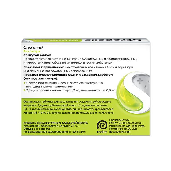 действующее вещество: 2,4-дихлорбензиловый спирт 1,2 мг, амилметакрезол 0,6 мг.