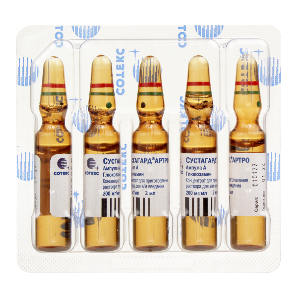 Препарат оказывает стимулирующее регенерацию хрящевой ткани, анаболическое, антикатаболическое, хондропротективное, противовоспалительное, анальгезирующее действия. Глюкозамина сульфат, активный компонент препарата СУСТАГАРД® АРТРО, представляет собой соль натурального аминомоносахаридного глюкозамина, который физиологически содержится в организме. Глюкозамин стимулирует синтез хондроцитами протеогликанов (гликозаминогликанов и гиалуроновой кислоты) синовиальной жидкости ингибирует ферменты (коллагеназу, фосфолипазу А2 и др.), вызывающие деструкцию хрящевой ткани препятствует образованию супероксидных радикалов, подавляет активность лизосомальных ферментов инициирует процесс фиксации серы в синтезе хондроитинсерной кислоты и способствует нормальному отложению кальция в костной ткани препятствует повреждающему действию кортикостероидов на хондроциты и нарушению синтеза гликозаминогликанов, индуцированному нестероидными противовоспалительными препаратами.
