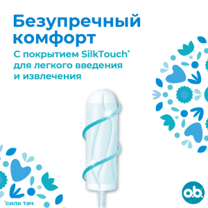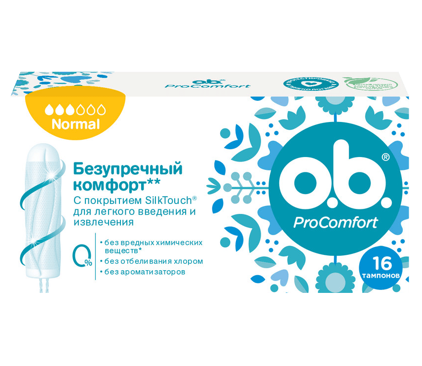 o.b.® ProComfort normal - наш продукт, рекомендованный для слабых и средних выделений. Покрытие SilkTouch® облегчает введение и извлечение.