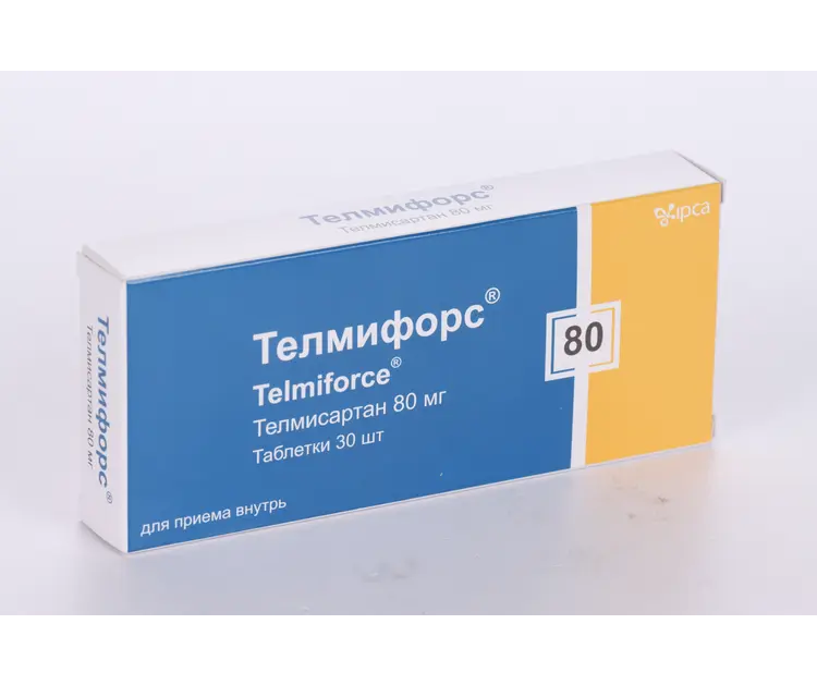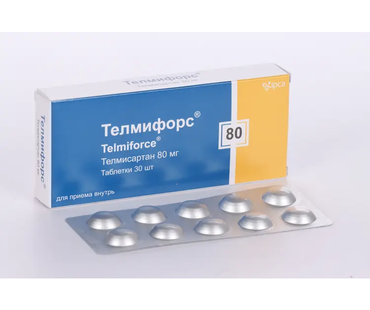 Телмифорс® (телмисартан) — специфический антагонист рецепторов ангиотензина II (АРА II) (типа AT1), эффективный при приёме внутрь. Обладает высоким сродством к подтипу AT1-рецепторов ангиотензина II, через которые реализуется действие ангиотензина II. Вытесняет ангиотензин II из связи с рецептором, не обладая действием агониста в отношении этого рецептора. Телмисартан связывается только с подтипом AT1-рецепторов ангиотензина II. Связь носит длительный характер. Не обладает сродством к другим рецепторам, в том числе к АТ2-рецептору и другим, менее изученным рецепторам ангиотензина. Функциональное значение этих рецепторов, а также эффект их возможной избыточной стимуляции ангиотензином II, концентрация которого увеличивается при назначении телмисартана, не изучены. Телмисартан снижает концентрацию альдостерона в крови, не ингибирует ренин в плазме крови и не блокирует ионные каналы. Телмисартан не ингибирует ангиотензинпревращающий фермент (кининаза II) (фермент, который также разрушает брадикинин). Поэтому усиление вызываемых брадикинином побочных эффектов не ожидается.