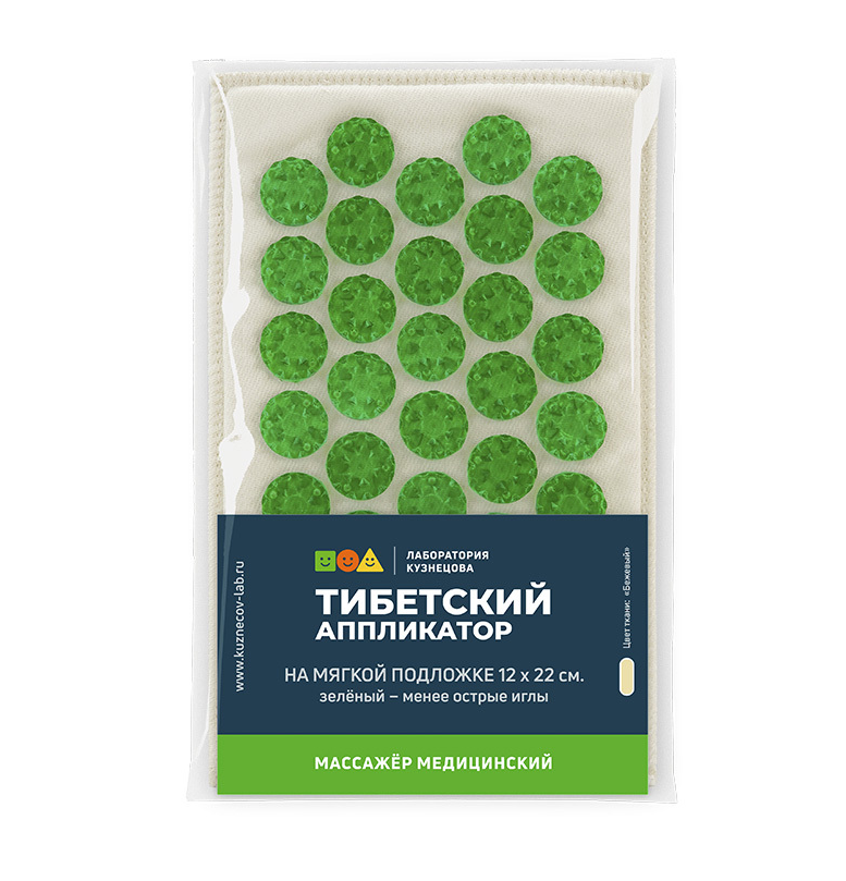 Тибетский аппликатор (современный аппликатор Кузнецова) на мягкой подложке 12 х 22 см - это небольшой акупунктурный игольчатый медицинский массажер, который удобно прижимать руками к различным частям тела (голове, суставам, рукам, ногам и т.д.). На нем также можно лежать, однако, если лежать на аппликаторе большего размера (41x60 см), то эффект будет выражен значительно сильнее.
