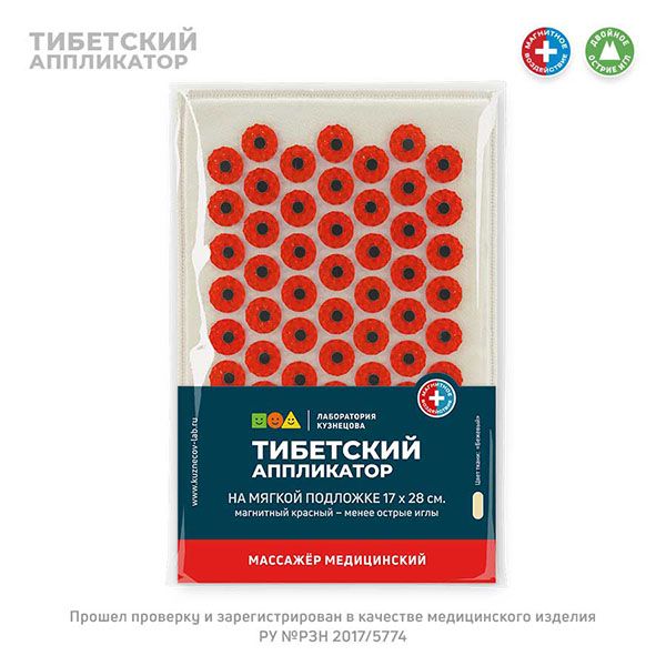 Тибетский аппликатор (современный аппликатор Кузнецова) на мягкой подложке 17 х 28 см - это небольшой акупунктурный игольчатый медицинский массажер, который удобно прижимать руками к различным частям тела (голове, суставам, рукам, ногам и т.д.). На нем также можно лежать, однако, если лежать на аппликаторе большего размера (41x60 см), то эффект будет выражен значительно сильнее.