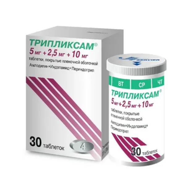 Трипликсам® - комбинированный препарат, включающий в себя три антигипертензивных компонента, каждый из которых дополняет действие других по контролю артериального давления у пациентов с артериальной гипертензией. Амлодипин — блокатор «медленных» кальциевых каналов (БМКК), производное дигидропиридина, индапамид — сульфонамидный диуретик, периндоприла аргинин — ингибитор фермента, превращающего ангиотензин I в ангиотензин II (ингибитор АПФ).