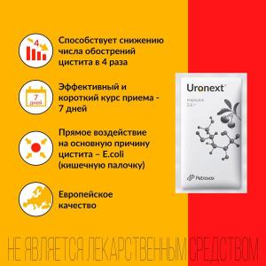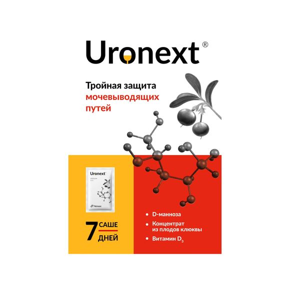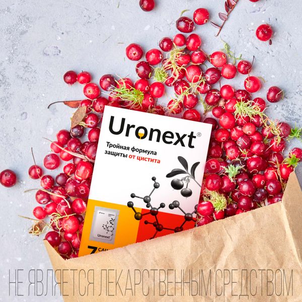 Уронекст® содержит комбинацию трех активных компонентов в оптимальных дозах, что обеспечивает продукту комплексное действие для полноценной защиты от инфекций мочевыводящих путей.
