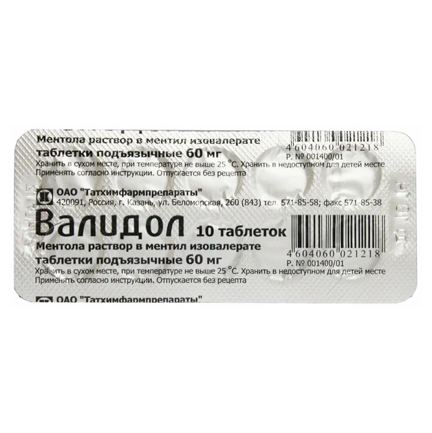 Действующее вещество: левоментола раствор в ментил изовалерате (валидол) — 60 мг.