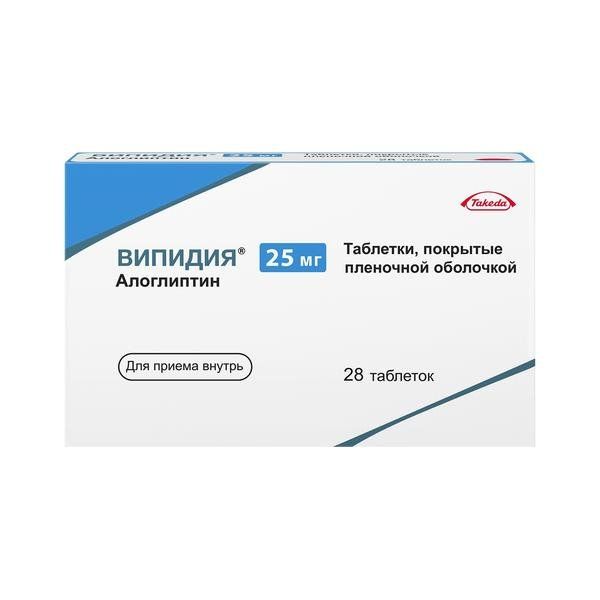 Рекомендуемая доза препарата Випидия составляет 25 мг один раз в сутки в качестве монотерапии или в дополнение к метформину, тиазолидиндиону, производным сульфонилмочевины или инсулину, или в качестве трёхкомпонентной комбинации с метформином, тиазолидиндионом или инсулином. Препарат Випидия может приниматься независимо от приёма пищи. Таблетки следует проглатывать целиком, не разжёвывая, запивая водой.