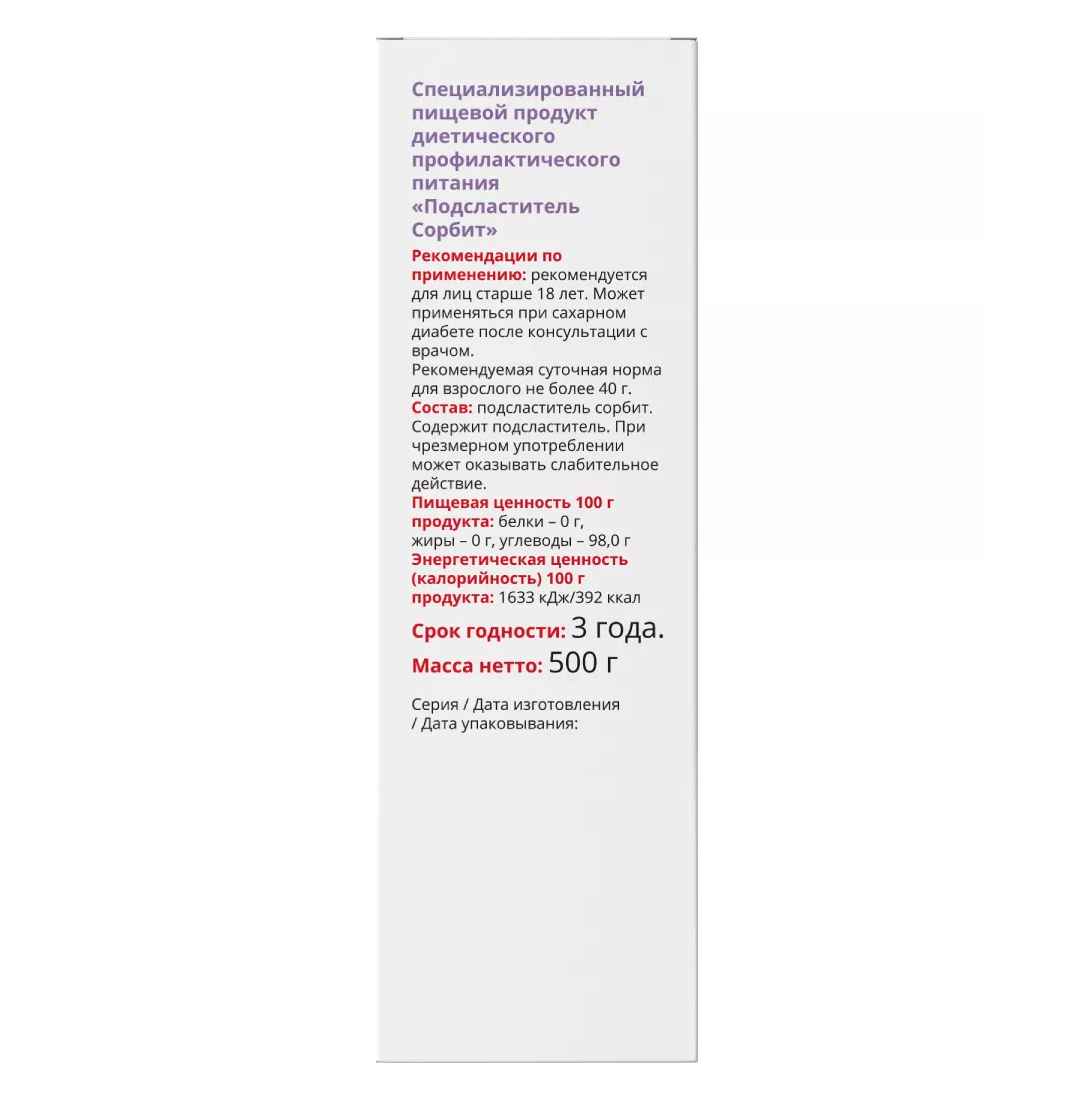 Специализированный пищевой продукт диетического профилактического питания «Подсластитель Сорбит».
