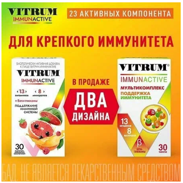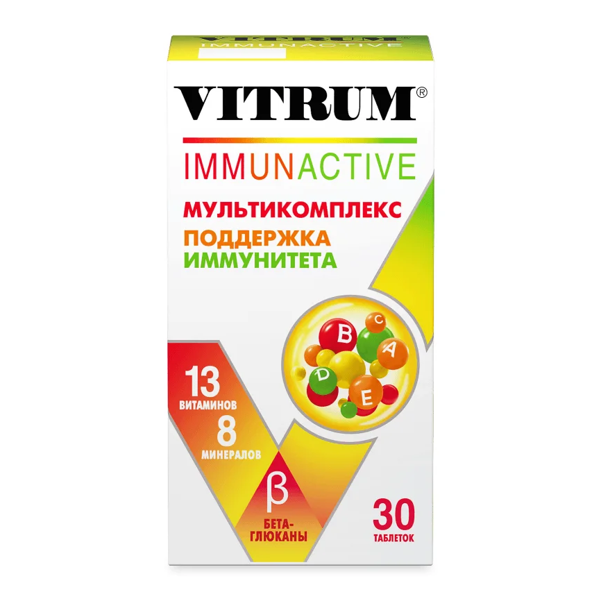 Витаминно-минеральный комплекс ВИТРУМ ИММУНАКТИВ VITRUM IMMUNACTIVE содержит 13 витаминов и 8 минералов, а также бета-глюканы и биофлаваноидный комплекс — необходимые компоненты, которые синергично работают для поддержки иммунитета: