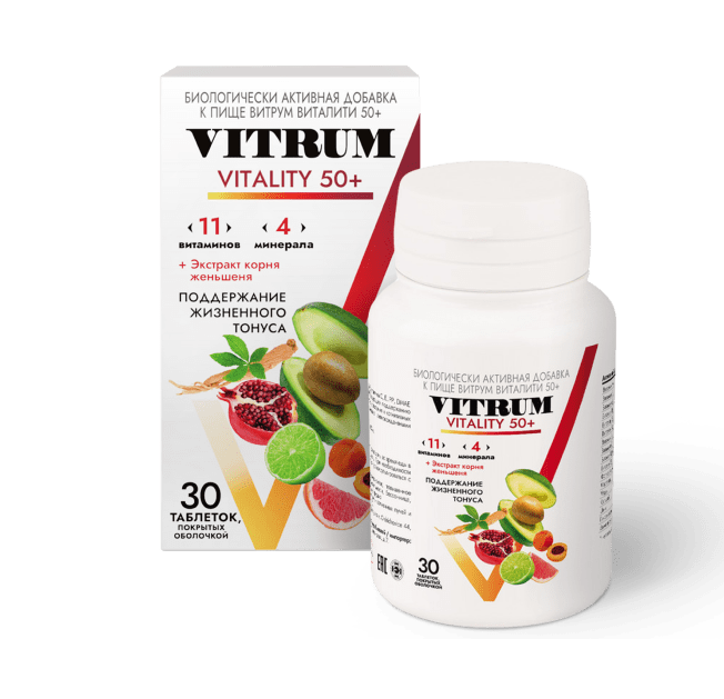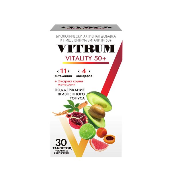 Биологически активная добавка к пище ВИТРУМ ВИТАЛИТИ 50+ (VITRUM VITALITY 50+) - это витаминно-минеральный комплекс, компоненты которого способствуют поддержанию жизненного тонуса, хорошего настроения и когнитивных функций, а также обладают антиоксидантными свойствами.