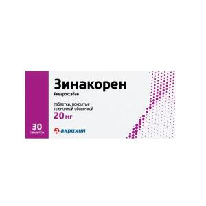 Препарат Зинакорен содержит действующее вещество — ривароксабан, который относится к антитромботическим средствам (антикоагулянтам), т.е. лекарственным препаратам, блокирующим образование тромбов. Его действие основано на подавлении фактора свёртывания крови (прямой ингибитор фактора Ха) и снижении образования тромбина, что приводит к уменьшению формирования тромбов в кровеносных сосудах.
