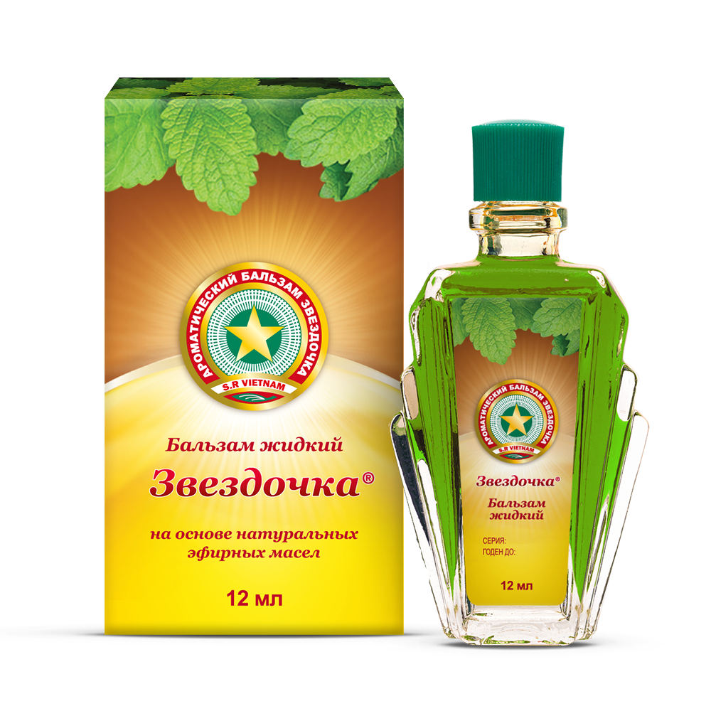 Звездочка жидкий бальзам изготовлен по древнему вьетнамскому рецепту на основе натуральных эфирных масел мяты перечной, камфоры, гвоздики и левоментола. Помогает при укусах насекомых, в обеззораживании и ароматизации воздуха. Помогает при головных болях и головокружениях.
